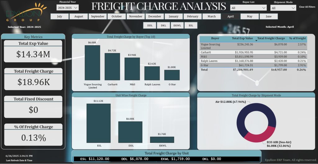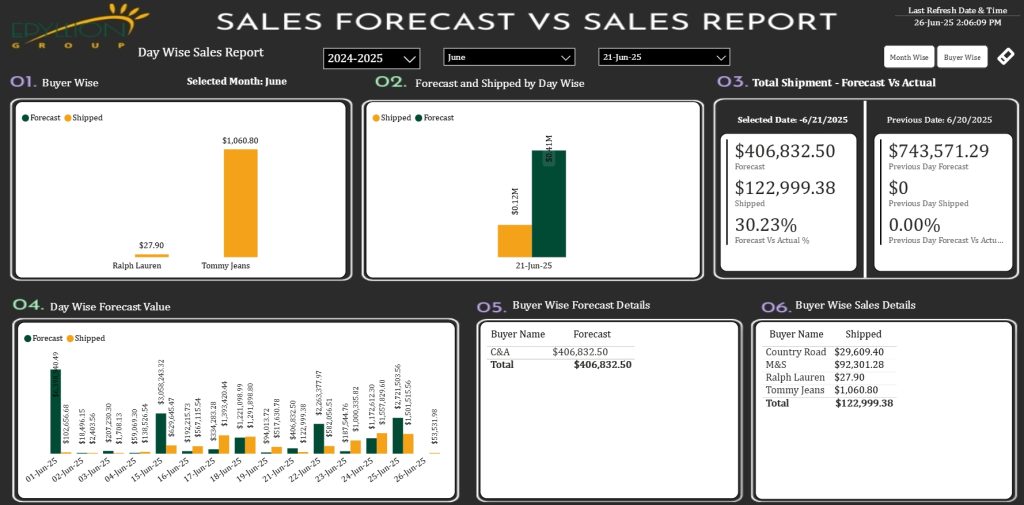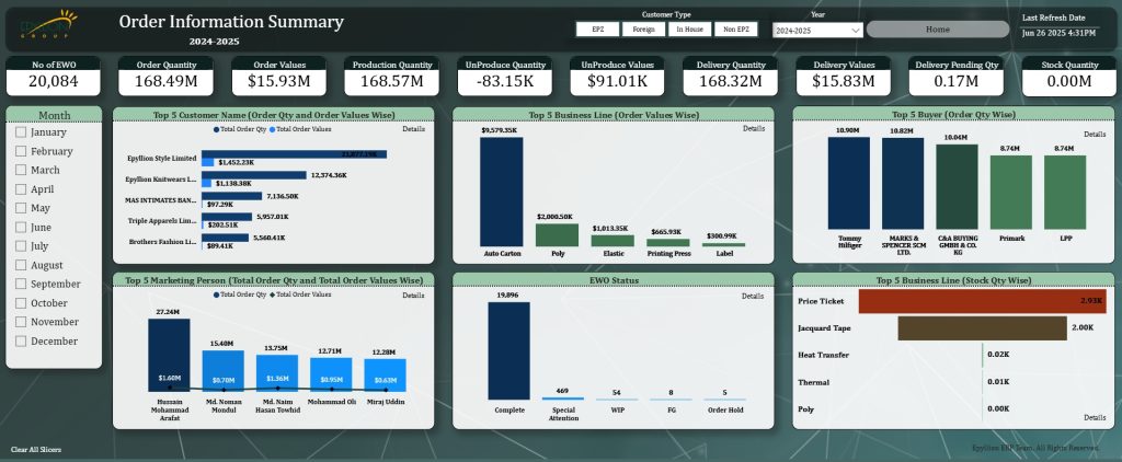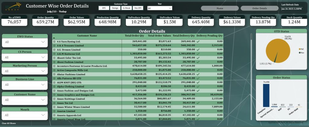 Description: Visualizes export performance across buyers, styles, shipment status, and country-wise distribution. Tracks shipment timelines, export value trends, and delivery performance to improve export planning and coordination.
